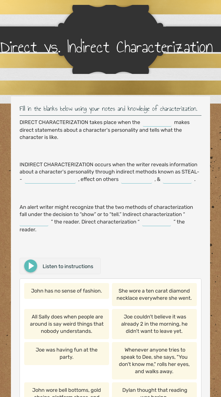 Max pitched alice the baseball. 22.09.2021 · indirect characterization shows who a character is based on what he/she does and says, while direct characterization tells the reader or audience exactly what type of person that character is. Indirect characterization is when character traits are revealed through a character's behavior. Instead of coming out and telling you what to think about the character, the author describes the person's appearance, actions and words, and sometimes even thoughts to help the reader form an opinion about the character. He said friday is the last day or he's going to take away some points. This is a brand new interactive notebook lesson i created specifically for this unit. To learn more about sentence structure, read this blog post about verb tenses. English language arts (ela) grade/level: 01.09.2016 · my algebra teacher gave me this worksheet last week and everyone had to bring it yesterday and i haven't done it yet. Alice is the indirect object. In "a sound of thunder," travis's dialogue with lesperance reveals how upset he is about eckels' having left the path. 23.09.2021 · direct characterization is a literary device authors use to establish their story's characters. Max (subject) pitched (verb) the baseball (direct object) to whom?
